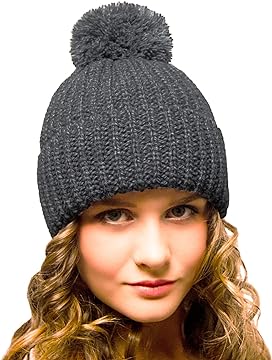 Bobble Hat Grey - Woolly Hat for Women - Chunky Beanie with Pom Pom