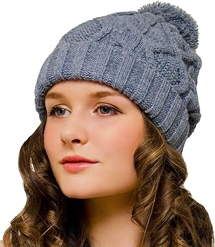Bobble Hat Denim Cable Knit - Ladies Woolly Hat - Winter Beanie for Women