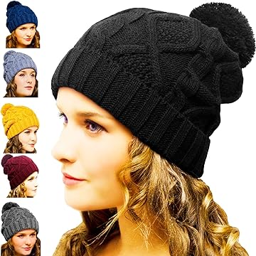 Bobble Hat Black Cable Knit - Ladies Woolly Hat - Winter Beanie for Women
