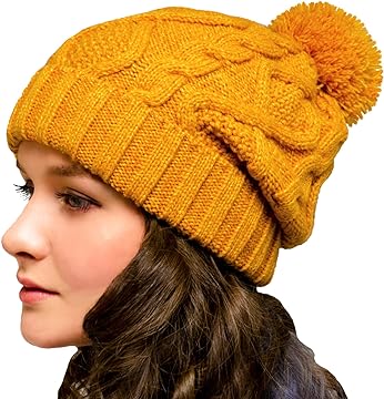 Bobble Hat Mustard Cable Knit - Ladies Woolly Hat - Winter Beanie for Women