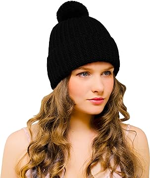Chunky Bobble Hat Black - Woolly Beanie with Pom Pom for Women