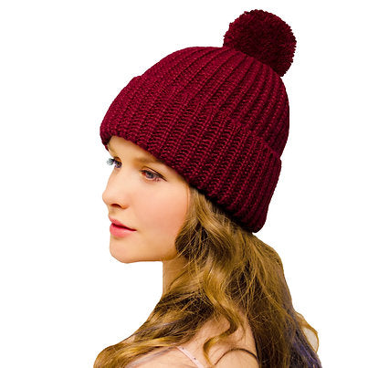 Chunky Bobble Hat Burgundy - Woolly Beanie with Pom pom for Women Men