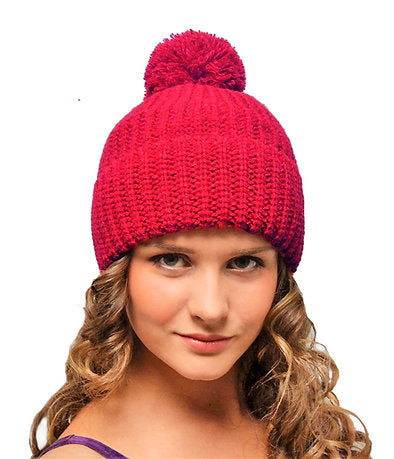 Chunky Bobble Hat Red - Ladies Woolly Beanie with Pom Pom for Women