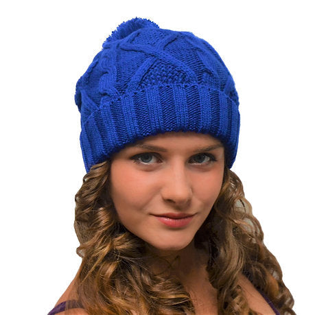 Bobble Hat Blue Cable Knit - Ladies Woolly Hat - Winter Beanie for Women